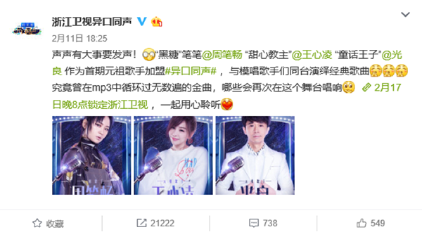 作为浙江卫视精心筹备的节目,《异口同声》未开播前,就受到观众们的热捧,官方微博也在各路粉丝的攻势下沦陷,人气爆棚,被网友一致认定为2018开年最有实力的重磅音乐节目。
